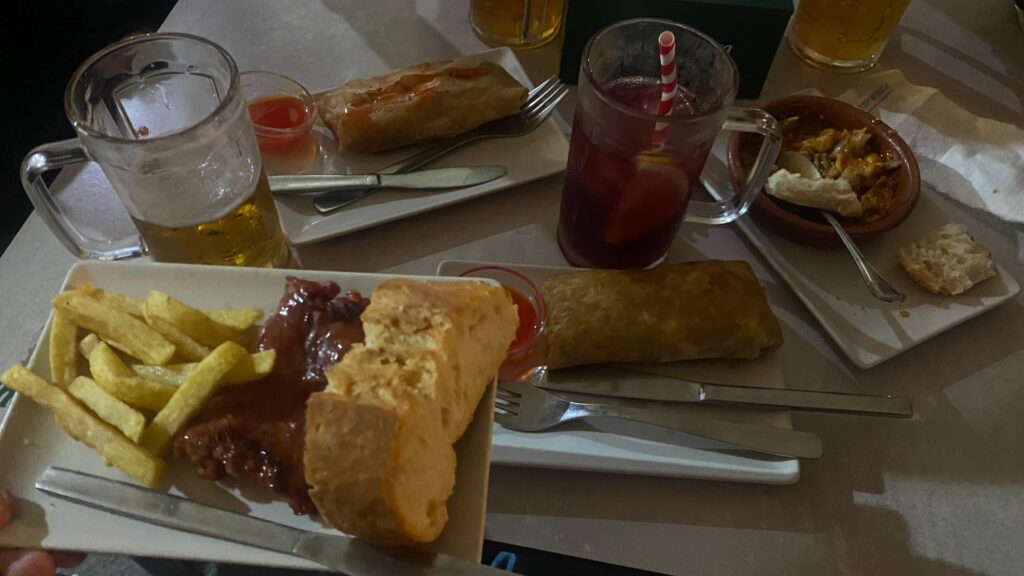 Entre sus tapas, merece una mención especial el rollito de primavera, bien ejecutado y con un equilibrio acertado entre sabor y textura, así como el sushi casero, que evidencia cuidado en la elaboración y una apuesta poco habitual en un bar de tapas. Junto a estas propuestas, se pueden encontrar tapas clásicas como carne en salsa, hamburguesas o calamares, bien resueltas y acordes al estilo del local.