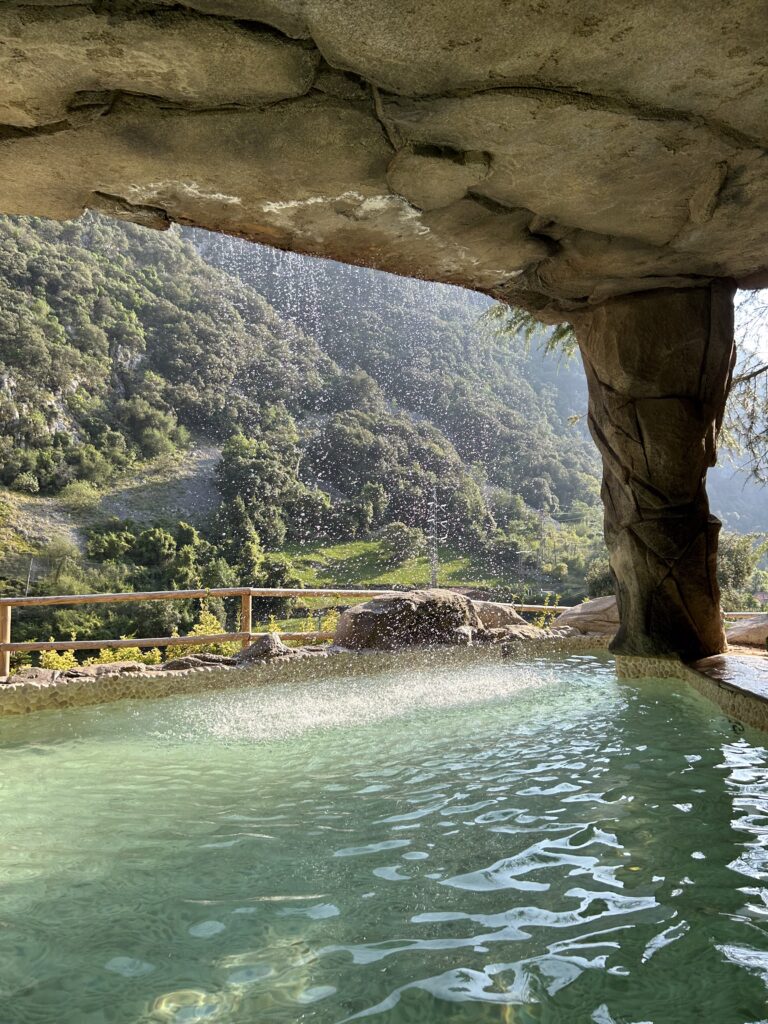 Nos alojamos dos noches en el Balneario de La Hermida, y fue, sin exagerar, uno de los grandes aciertos del viaje. Después de un día recorriendo montañas, nada mejor que sumergirse en sus baños termales, dejar que el agua caliente haga su trabajo y olvidarte por completo del reloj. Pero lo mejor venía después: salir al aire libre y bañarte en la zona exterior junto a la cascada, con el contraste del aire fresco y el agua caliente. Ese momento, rodeados de montaña y con el sonido del agua cayendo, fue de los que no se olvidan.