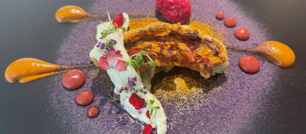 Bogavante gallego con cítricos y especias orientales, presentado como una obra de arte comestible.