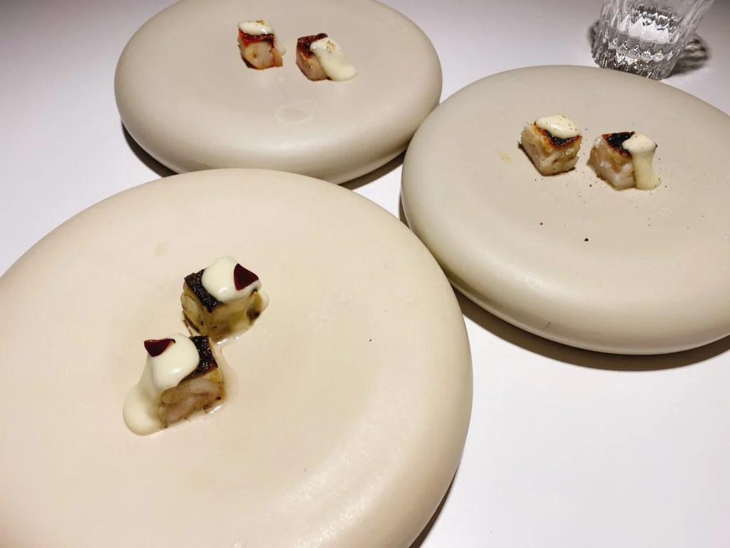 Pequeños bocados que parecen cápsulas de sabor. La espuma de kimchi aporta acidez y frescura, mientras el caviar aporta un toque salado y lujoso.