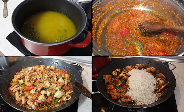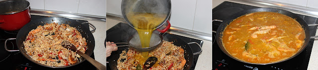 2. Cuando el sofrito esté dorado, agrega las dos tazas de arroz, un poco de azafrán, una cucharada de pimentón y tomates.