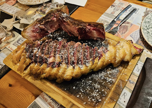 Sirven la carne poco hecha o al punto sobre una tabla de madera, contando con una piedra caliente para terminar el punto de cocción al gusto de los comensales. Cuenta con una extraordinaria cava donde guardan carnes maduradas y frescas que hacen las delicias del carnívoro mas exigente.